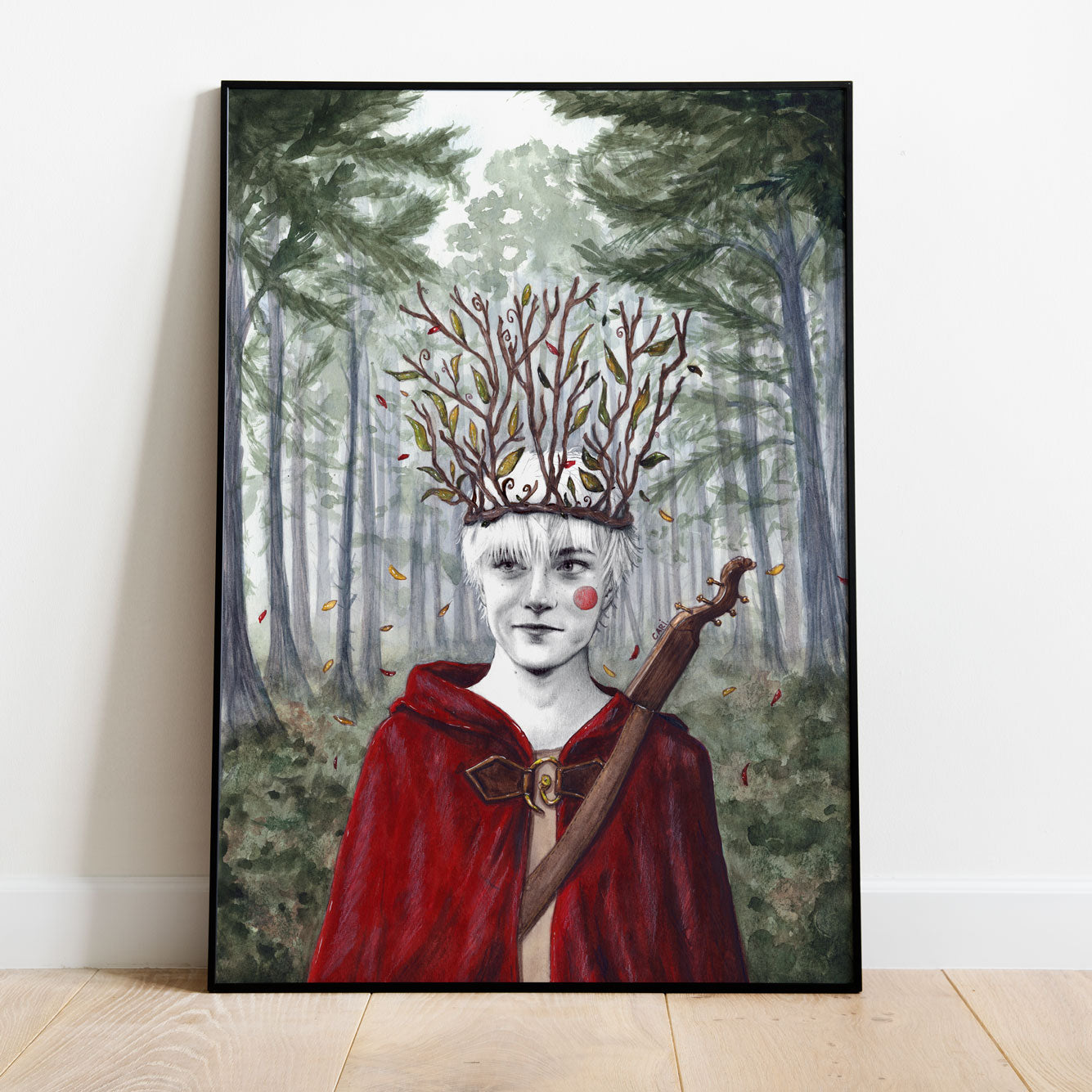 Nadie sabía su nombre, pero algunos lo habían visto. Se deslizaba entre los árboles con la seguridad de quien se sabe en casa, como si su presencia fuera tan antigua y profunda como las raíces que entrelazaban la tierra. Su capa del color de la sangre lo envolvía como un cálido abrazo, y sobre su cabeza se erguía una corona de ramas, alta y retorcida, un regalo del viento y los árboles.