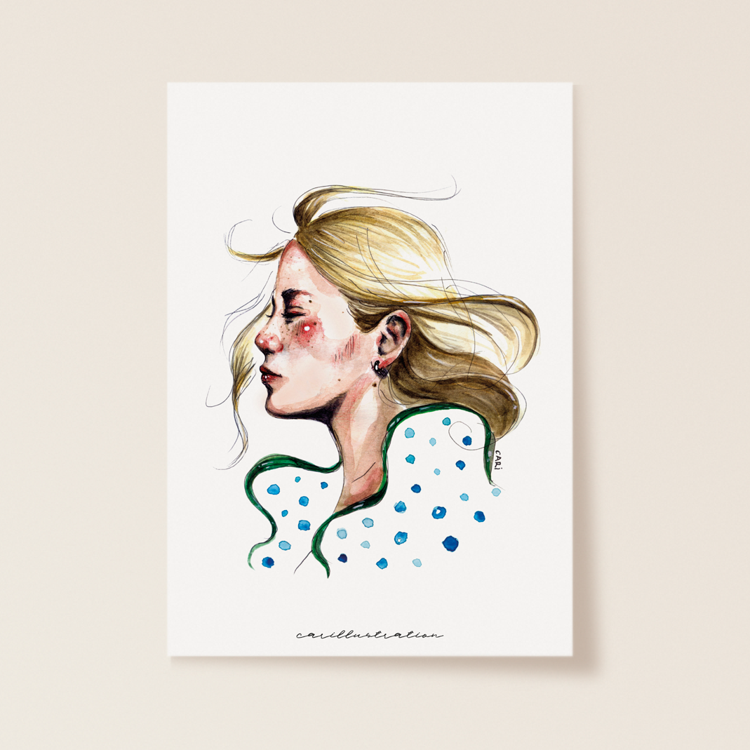 Print of "The Wind Girl" , an evocative and sensory illustration. It is the only one of my girls in which I have applied color (watercolor) to the skin and hair.