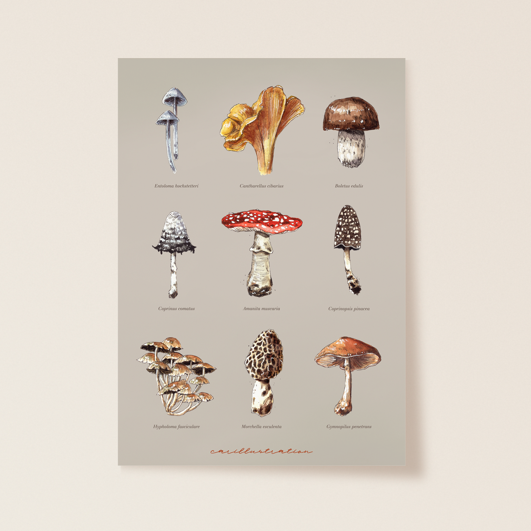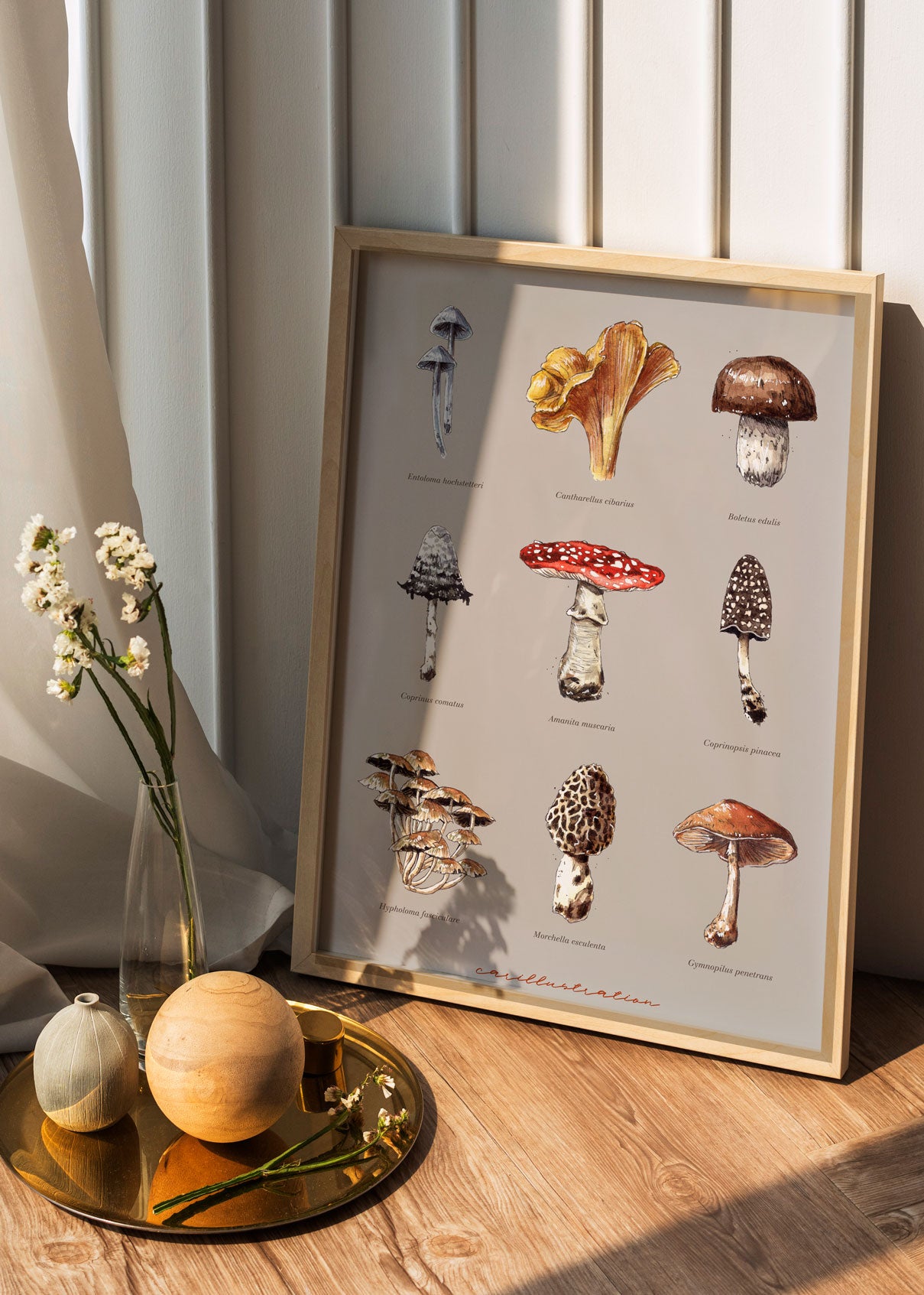 La lámina impresa "Mushroom Studio" sigue ese estilo vintage de los libros de botánica, llena de magia otoñal.