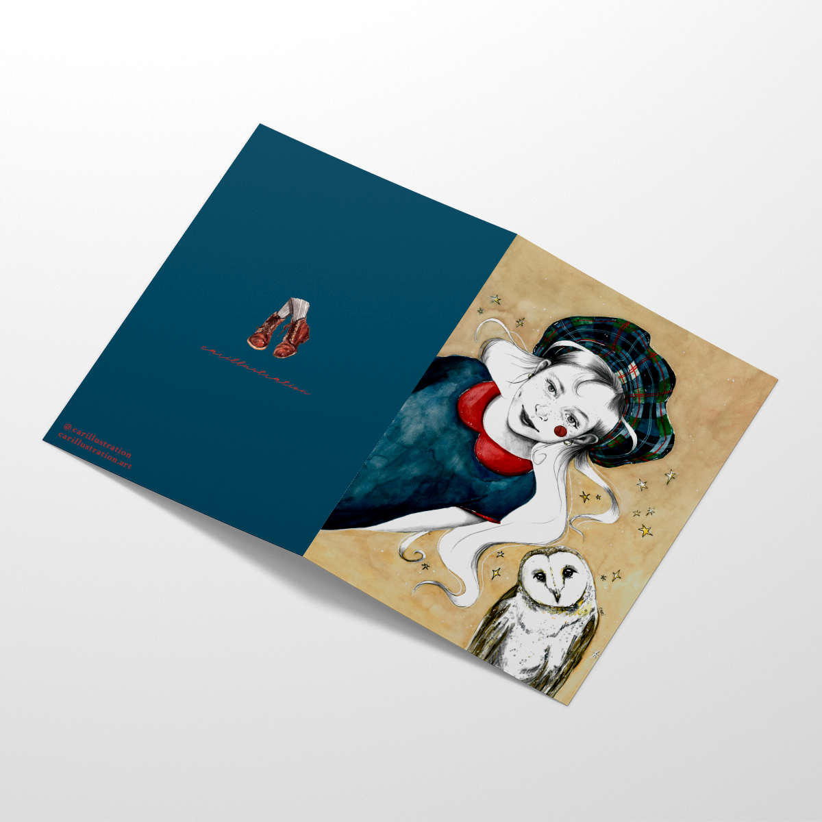 Una tarjeta mágica, llena de ternura y con un toque escocés. Impresa en alta calidad confeccionada a partir de una ilustración realizada a mano a lápiz y acuarela.