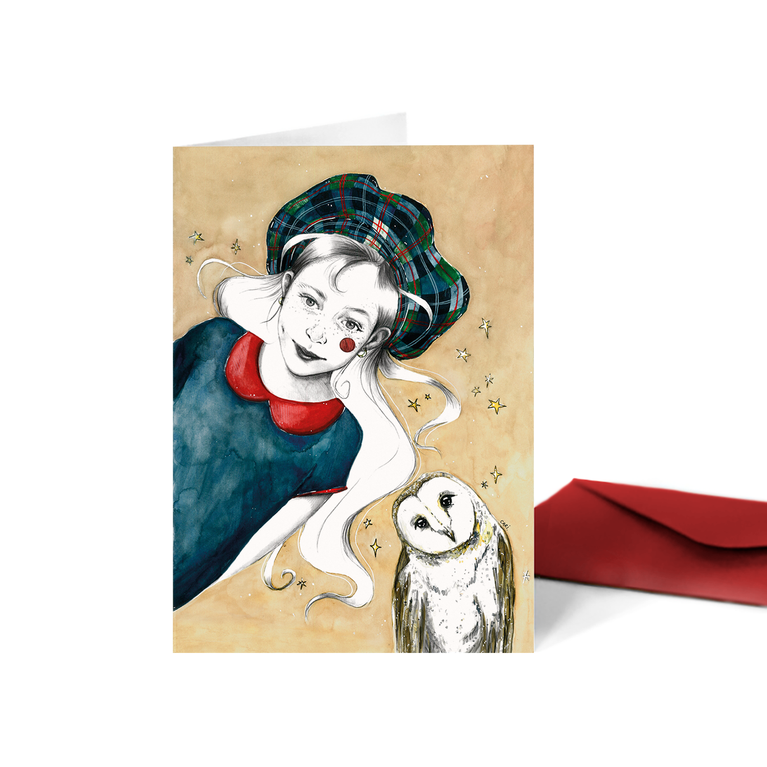 Esta preciosa tarjeta ilustrada representa a una niña pizpireta y su lechuza, su inseparable compañera de juegos. Ambas se asoman a saludarte como si os conocierais de antes... ¿Qué se traerán entre manos?
