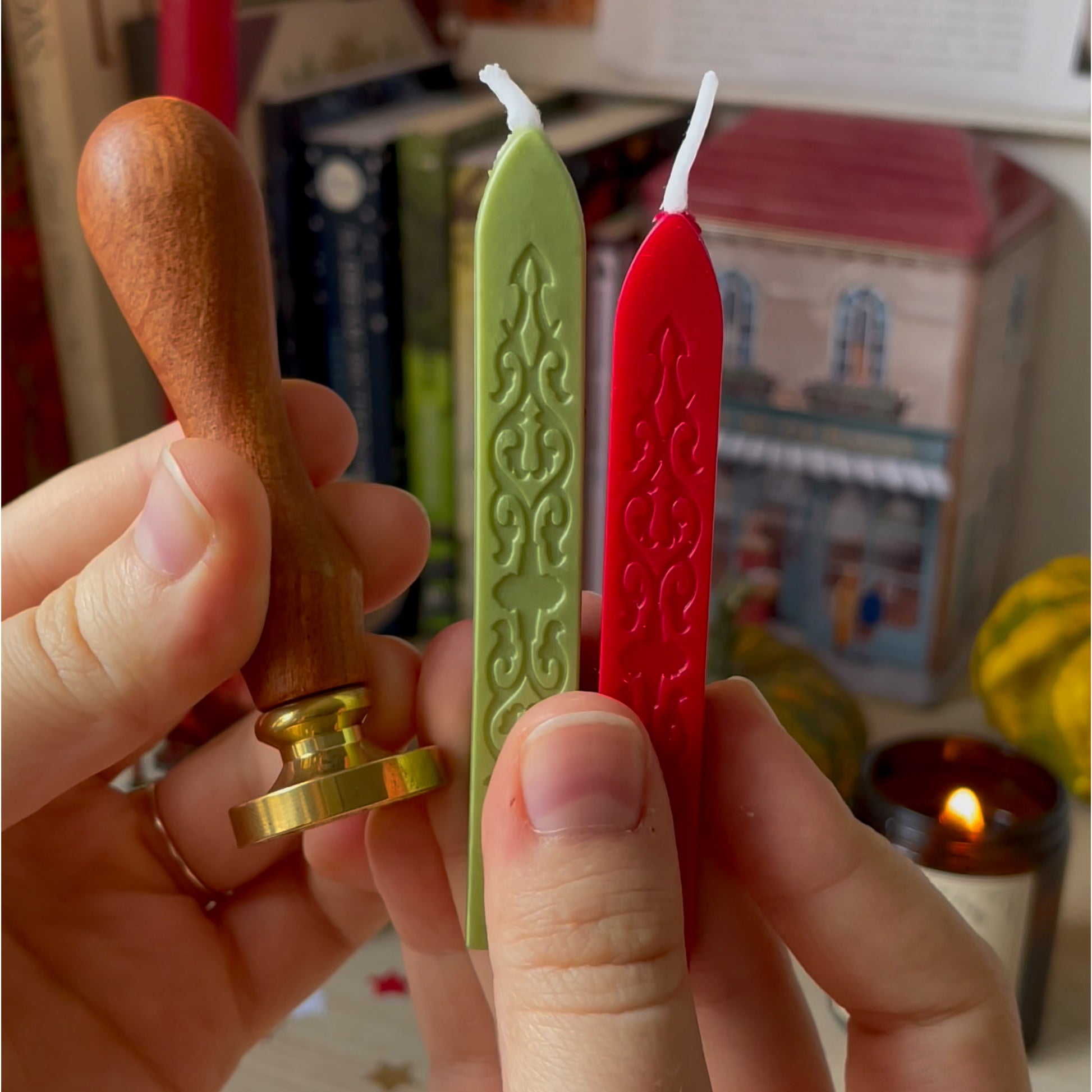 • 2 barritas de lacre con mecha, de 2 colores: verde salvia brillante y rojo oscuro mate
