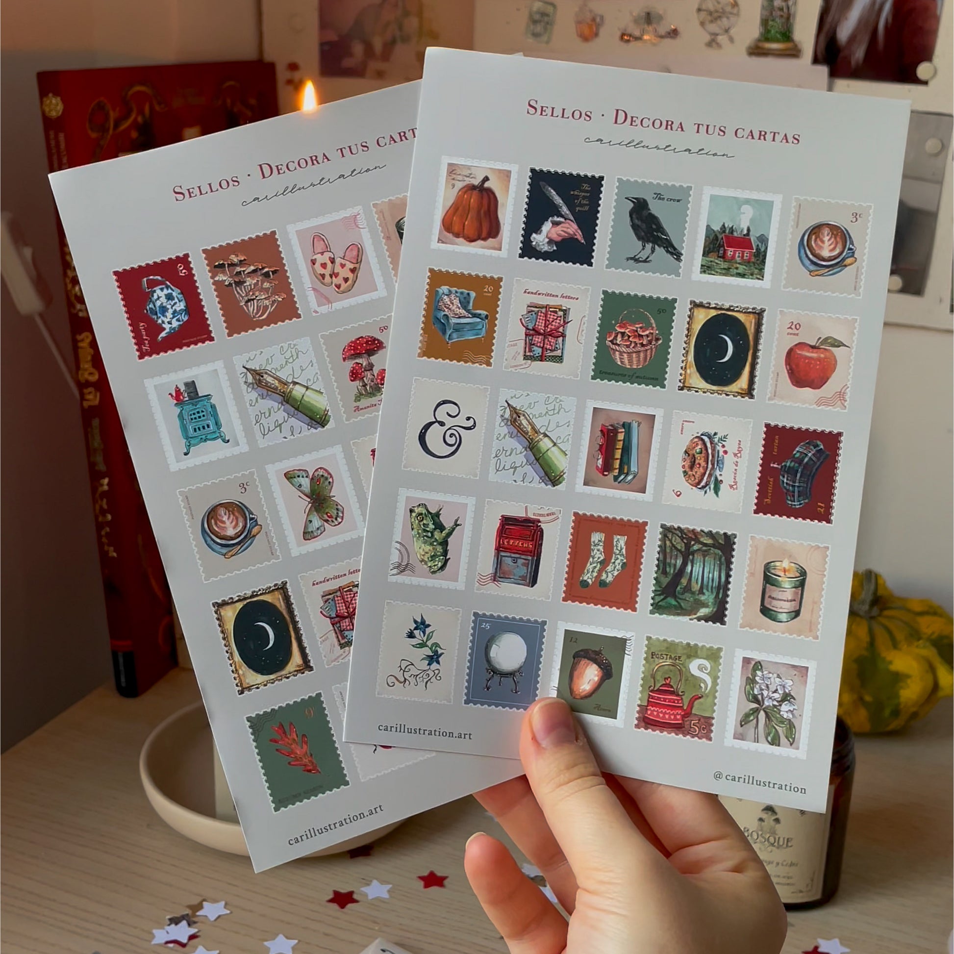 • 2 hojas con 50 sellos postales decorativos adhesivos (ilustraciones realizadas a mano a tinta y acuarela)