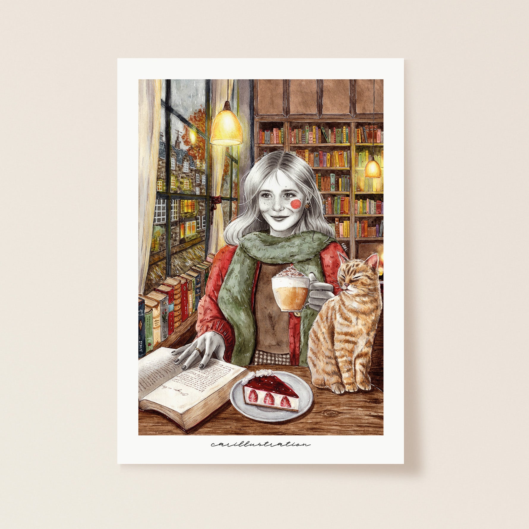 Lámina impresa "Charmss Café", una ilustración cozy que representa a una chica leyendo un libro en una cafetería-librería en Edimburgo acompañada de un gato atigrado mientras bebe un chocolate caliente.