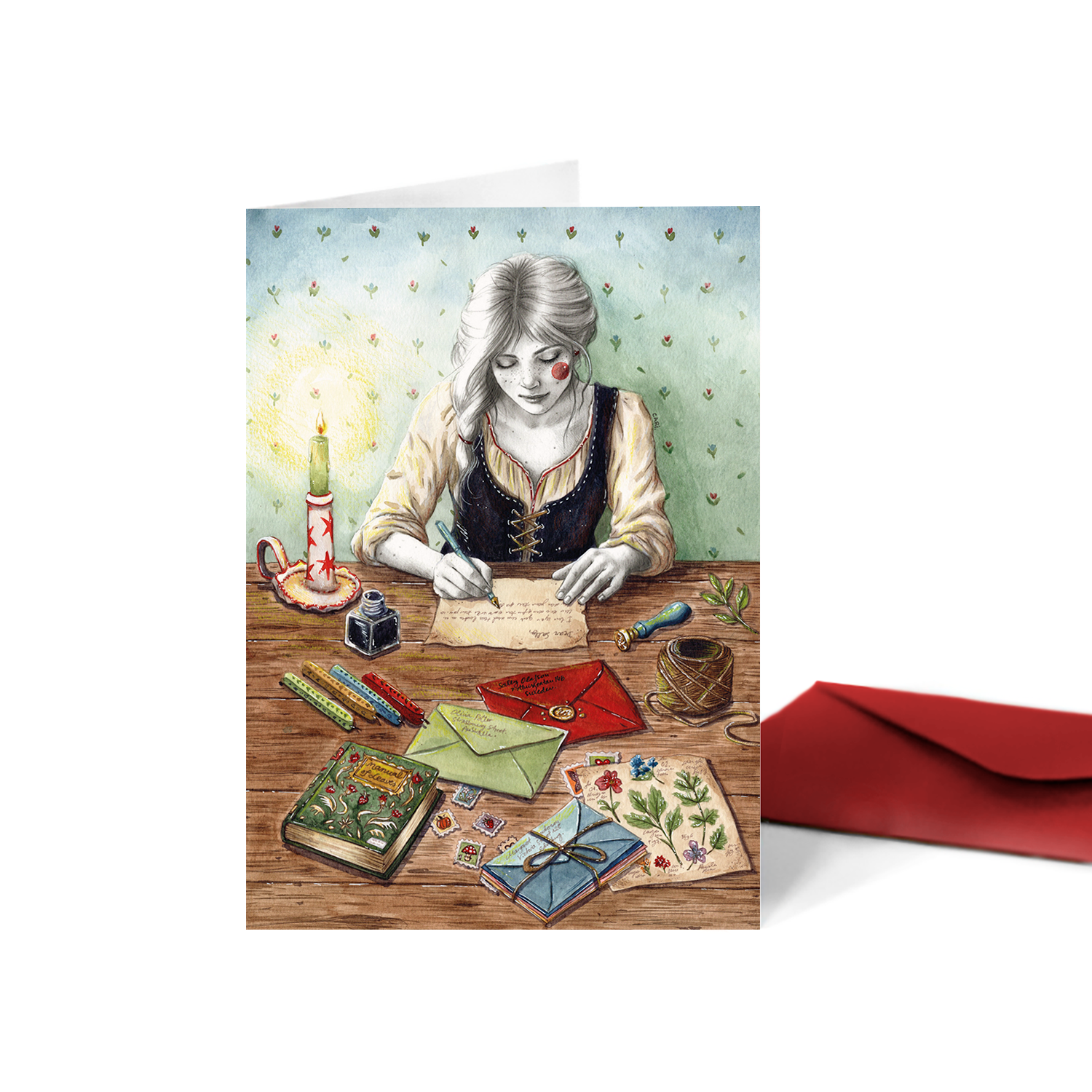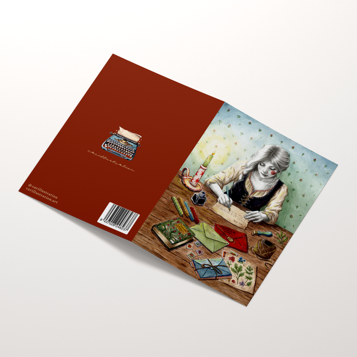 Esta preciosa tarjeta ilustrada representa a una chica escribiendo cartas sobre su escritorio de madera a la luz de las velas. Si quieres leer más sobre la historia y el proceso de esta ilustración, haz clic aquí :)